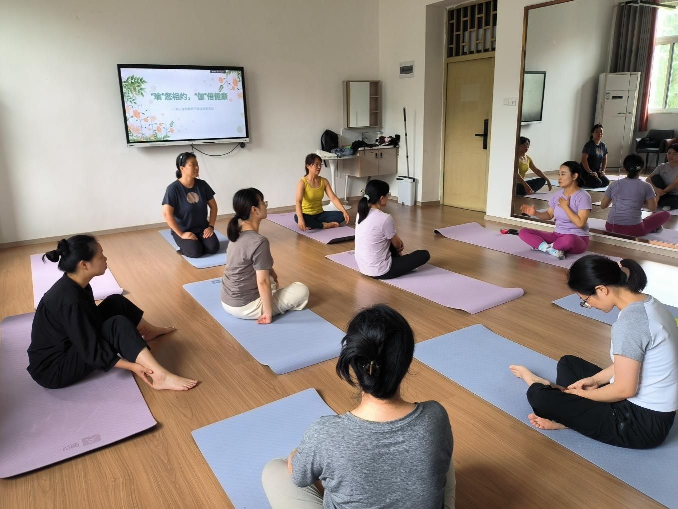 中午阳光透过教二楼旁的梧桐叶洒下斑驳光影。9名来自学院不同系部的教师暂放下繁忙的工作齐聚“职工小家”,在垫上开启了一小时的“身心疗愈之旅”。